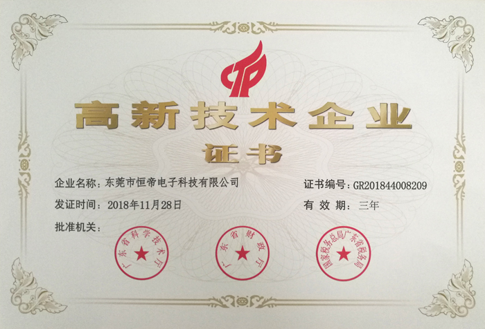 近日,經國家科技部、財政部、國家稅務總局專家評審,東莞市恒帝電子科技有限公司獲得了由廣東省科技廳、財政廳、省國稅局、省地稅局聯(lián)合頒發(fā)的《高新技術企業(yè)》證書,這標志著我司成為國家高新技術企業(yè)的一員。