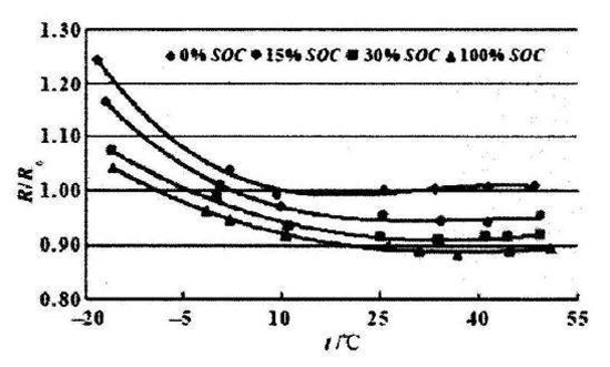 鋰電池溫度與電阻的關(guān)系,如下圖所示。不同的曲線代表電池自身不同的荷電量。任何一個(gè)荷電量下,電池內(nèi)阻都隨著溫度的降低而明顯升高,荷電量越低的電芯,內(nèi)阻越大,并且這個(gè)趨勢(shì)也隨著溫度的變化而保持不變。