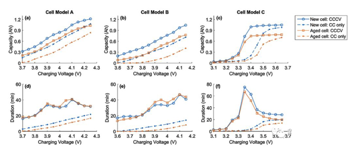 所謂的加速充電模式是在CCCV充電模式的基礎(chǔ)上增加了一個(gè)大電流的CC或者恒功率充電過(guò)程,從而達(dá)到降低充電時(shí)間的目的(如下圖e所示),有研究表明加速充電模式能夠有效的提升鋰電池的充電效率,同時(shí)又不會(huì)對(duì)鋰電池的循環(huán)壽命產(chǎn)生顯著的影響。