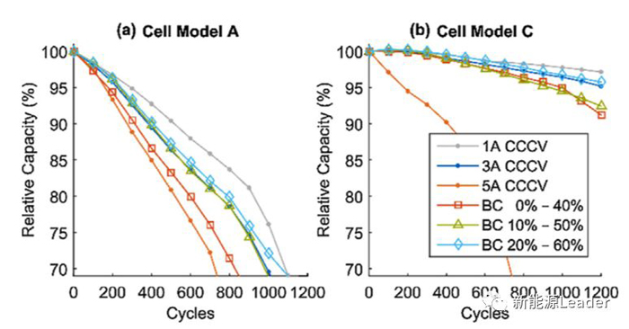 下圖為電池A和C采用BC充電策略的循環(huán)性能,從圖中能夠看到對(duì)于電池A,如果從0%開(kāi)始采用加速充電(5A)則會(huì)導(dǎo)致電池的衰降速度顯著增加,與5A電流的CCCV充電策略接近。而如果從10%SoC和20%開(kāi)始加速充電,則循環(huán)壽命會(huì)大大改善,與3A電流的CCCV充電策略接近。而對(duì)于電池C,如果開(kāi)始加速充電的SoC為0%和10%則會(huì)導(dǎo)致電池的衰降速度明顯加速,而如果在20%SoC開(kāi)始加速充電,則對(duì)于電池的循環(huán)壽命的影響較小。這也表明在較低的SoC下進(jìn)行加速充電會(huì)導(dǎo)致電池的循環(huán)壽命受到顯著的影響。